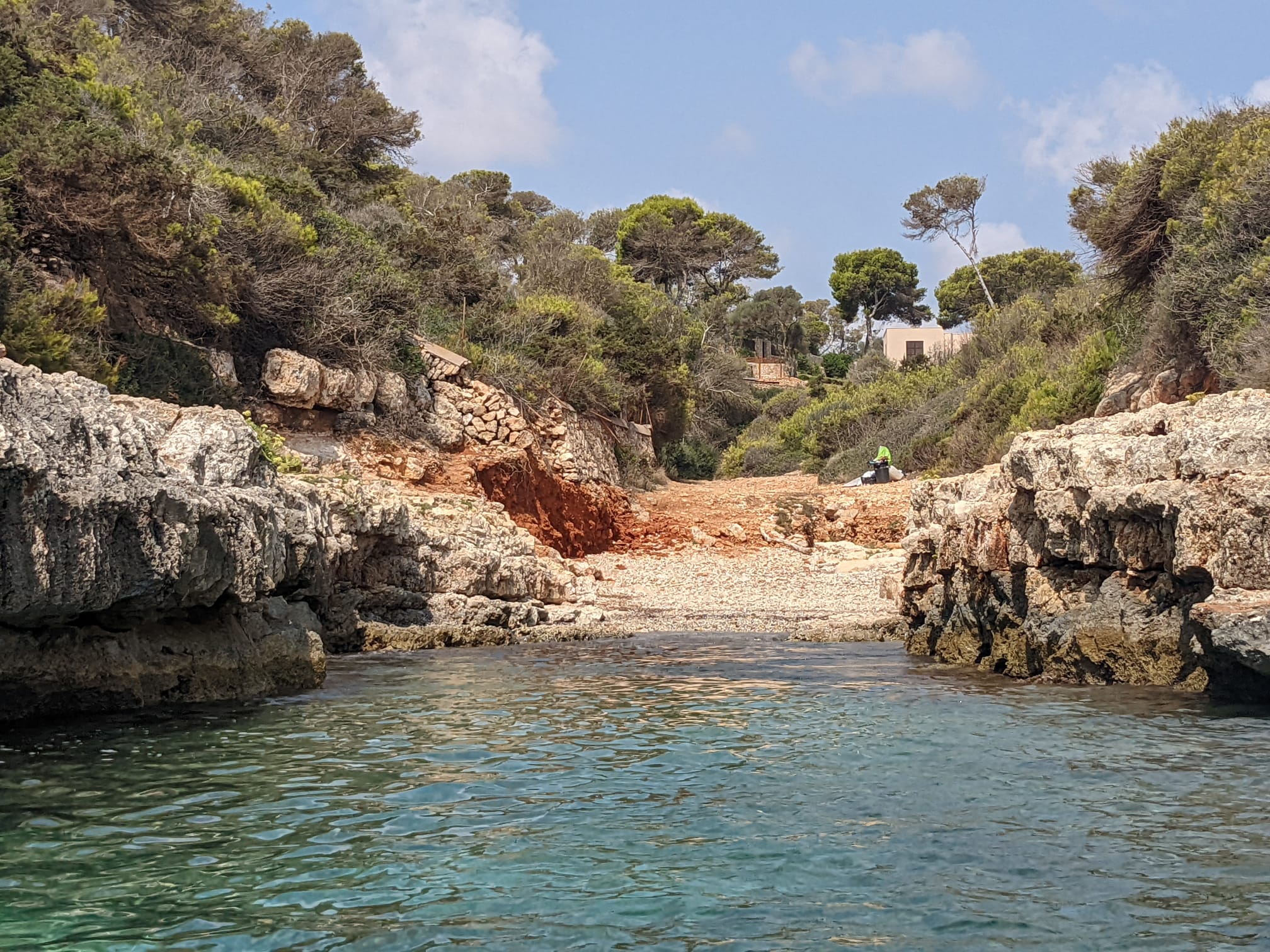 Nosotros al ver la situación acabamos dejando el kayak en Caló d’es Macs, una pequeña playa de arena situada junto a Es Pontàs donde pudimos hacer un poco de snorkel y disfrutar del arco de piedra. No obstante, también tenéis la posibilidad de dejar el kayak tanto en la misma cala Santanyí, o en cala Llombards.