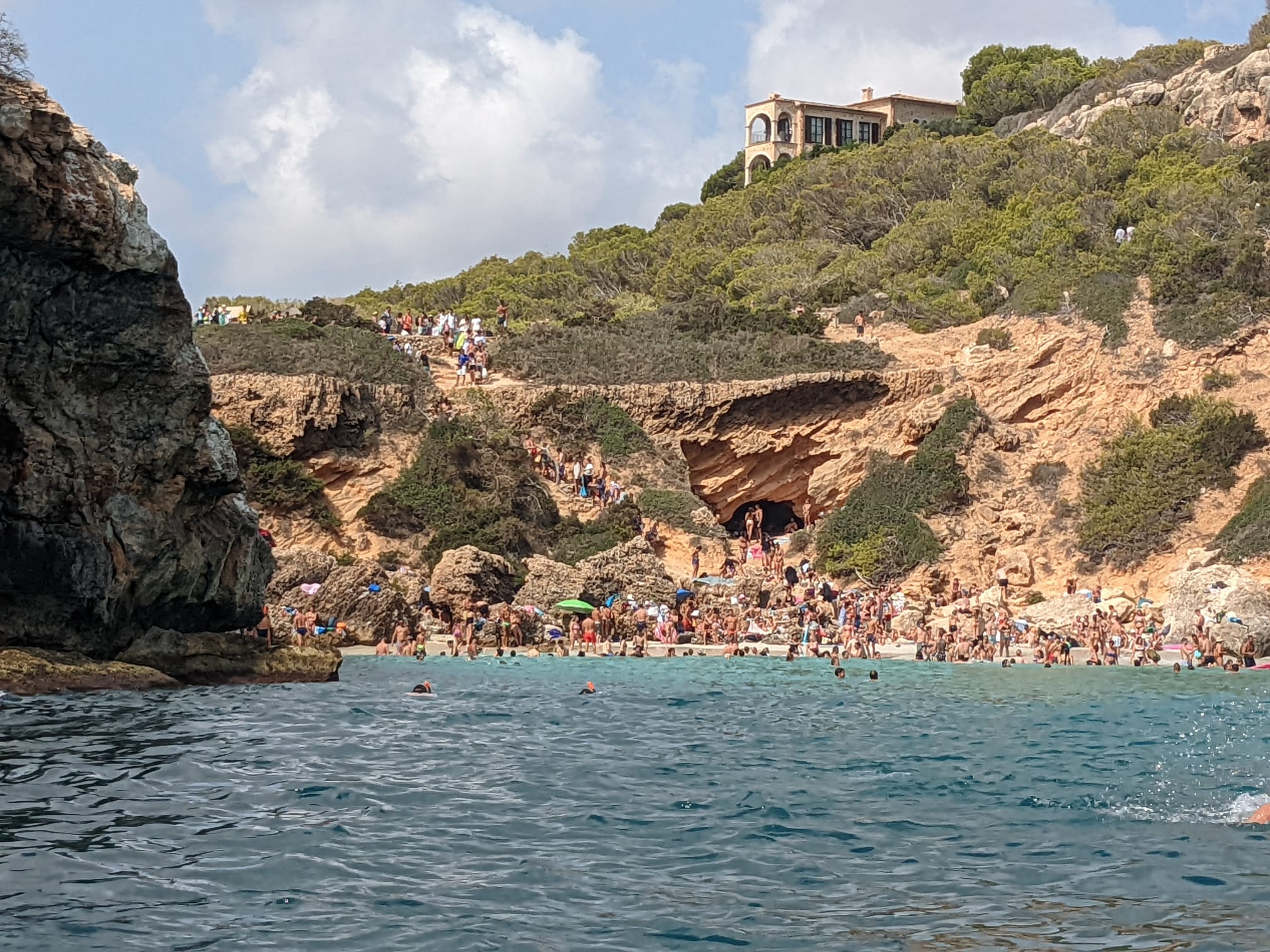 Finalmente llegamos a Caló d’es Moro, una playa preciosa en la que no pudimos bajar del kayak por la cantidad de gente que se aglomera en ella. La intención de este post es explicaros que existen otras formas de acceder a esta cala sin tener que caminar media hora por la montaña, pero nosotros no recomendamos ir en temporada alta, ya que si queréis acceder en los meses de julio y agosto tendréis que llegar como muy tarde a las 8 de la mañana, pegaros un chapuzón de un par de horas y volveros si no queréis acabar volviéndoos locos.