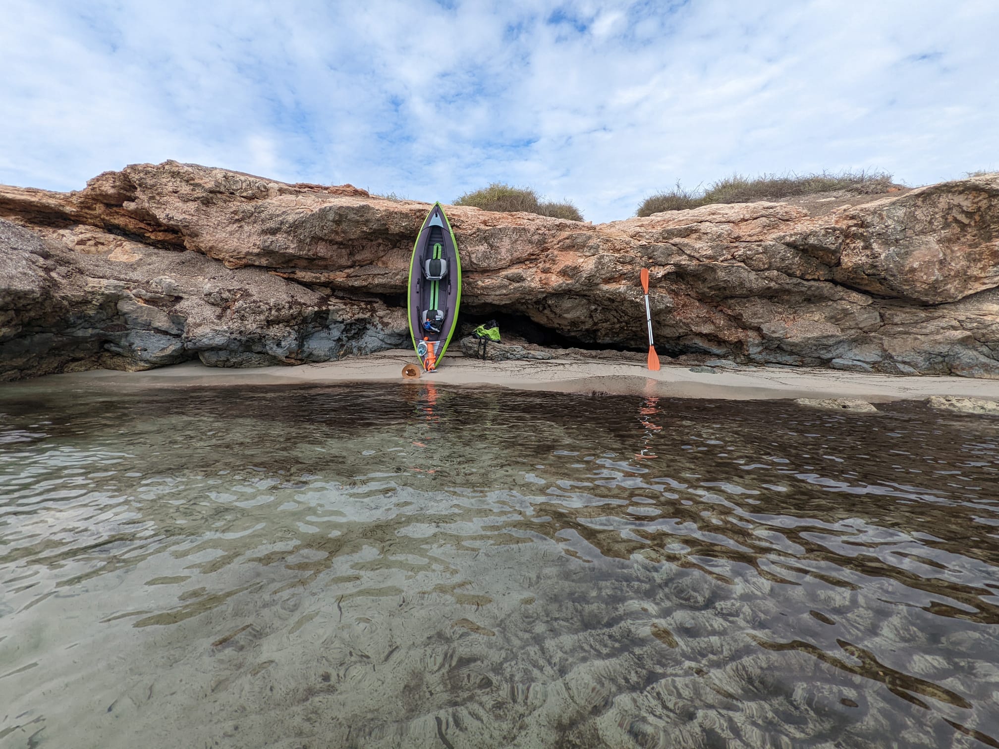 Finalmente llegamos a la Platja de S’algar, una joya escondida en el este de Mallorca, libre de multitudes y con un entorno virgen. Es una cala de rocas rodeada de acantilados, donde podréis encontrar una pequeña playita de arena en la que drenar el kayak, perfecta para disfrutar de un buen snorkel en el que podréis deleitaros con muchas especies marítimas, en concreto, familias de mantas raya, morenas y algún pulpo escondido entre las rocas.